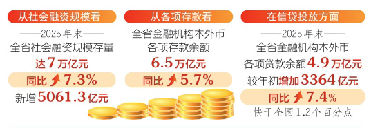 從社會融資規(guī)???,2025年末,全省社會融資規(guī)模存量達7萬億元,同比增長7.3%;新增5061.3億元。其中,投向?qū)嶓w經(jīng)濟的本外幣貸款和政府債券凈融資增量合計占全部社融增量的94.4%。
