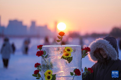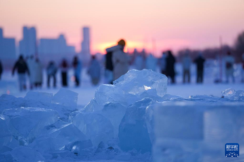 時(shí)下,“冰城”哈爾濱市正值冰雪旅游旺季。松花江哈爾濱段一處采冰場(chǎng),由于大量堆積高純凈度的冰塊,而被游客稱為“鉆石?!保蔀榫W(wǎng)紅景區(qū)。只要是晴好天氣,都會(huì)有許多游客來(lái)到“鉆石?!本皡^(qū),欣賞浪漫的落日美景。