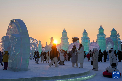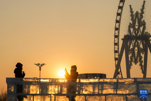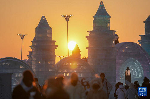 夕陽西下,落日余暉為哈爾濱冰雪大世界披上暖金霞光,游客盡享冬日的浪漫與溫柔。