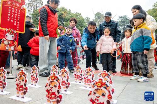 2月4日,在浙江省湖州市長(zhǎng)興縣雉城街道古城公園,社區(qū)居民參與“馬年套圈圈福氣”趣味體驗(yàn)活動(dòng)。(新華社發(fā) 譚云俸 攝)