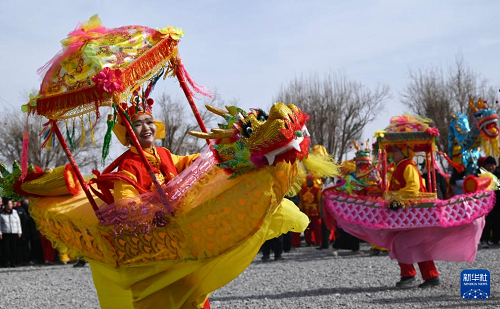 2月4日,人們?cè)诟拭C省敦煌市白馬塔景區(qū)“打春?!?。(新華社發(fā) 張曉亮 攝)