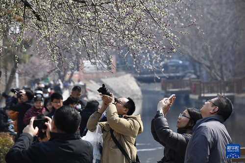 3月8日,市民在朝陽區(qū)二道溝河六里屯段的“山桃花溪”賞花休閑。(新華社記者 李欣 攝)