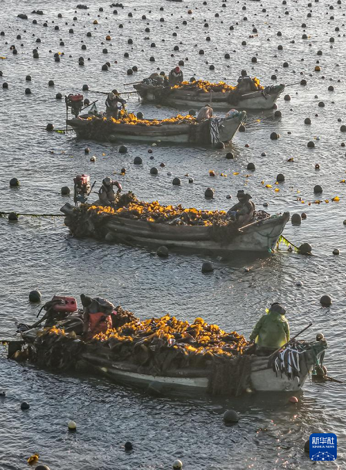 眼下,在我國(guó)海帶主產(chǎn)區(qū)山東省榮成市,海洋牧場(chǎng)海帶養(yǎng)殖區(qū)一派繁忙景象。養(yǎng)殖戶對(duì)近岸養(yǎng)殖區(qū)達(dá)到成熟標(biāo)準(zhǔn)的海帶分批收割,為后期收割的海帶留出生長(zhǎng)空間,以便提高海帶產(chǎn)量和質(zhì)量。