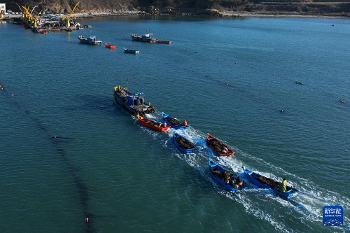3月9日,在山東省榮成市愛倫灣海洋牧場(chǎng),滿載海帶的養(yǎng)殖船駛往碼頭(無(wú)人機(jī)照片)。(新華社發(fā) 王福東 攝)
