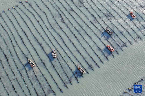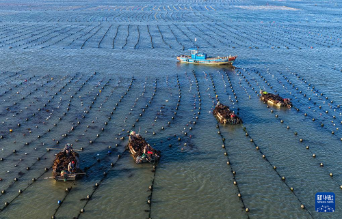 3月9日,在山東省榮成市愛倫灣海洋牧場(chǎng)海帶養(yǎng)殖區(qū),養(yǎng)殖工人收獲海帶(無(wú)人機(jī)照片)。(新華社發(fā) 王福東 攝)