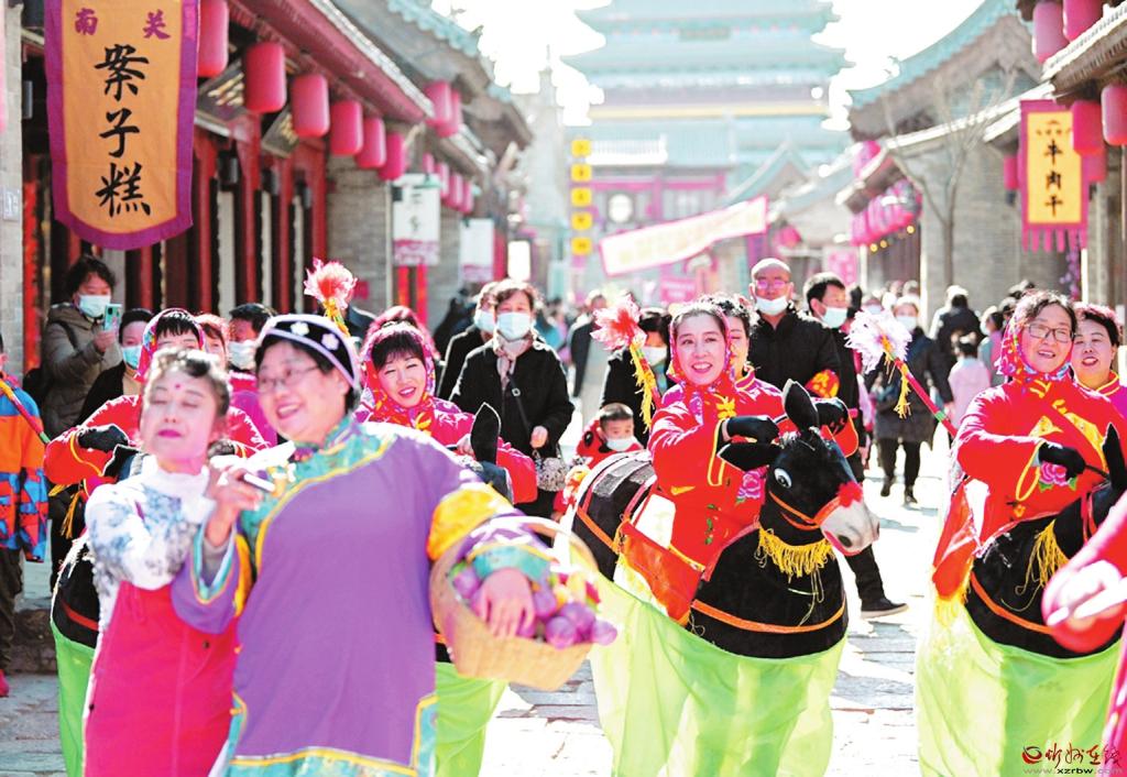 2月17日,忻州古城,民間文藝表演隊(duì)正在街頭巡演。春節(jié)期間,忻州古城舉辦“逛古城、品文化、識(shí)忻州”旅游文化活動(dòng),雄獅起舞、八音吹奏、秧歌表演等一系列富有當(dāng)?shù)靥厣拿耖g文藝活動(dòng)精彩紛呈,吸引了眾多旅游者游覽觀賞,整個(gè)古城呈現(xiàn)出一派喜慶祥和的節(jié)日氣氛。 (李兆民 攝)
