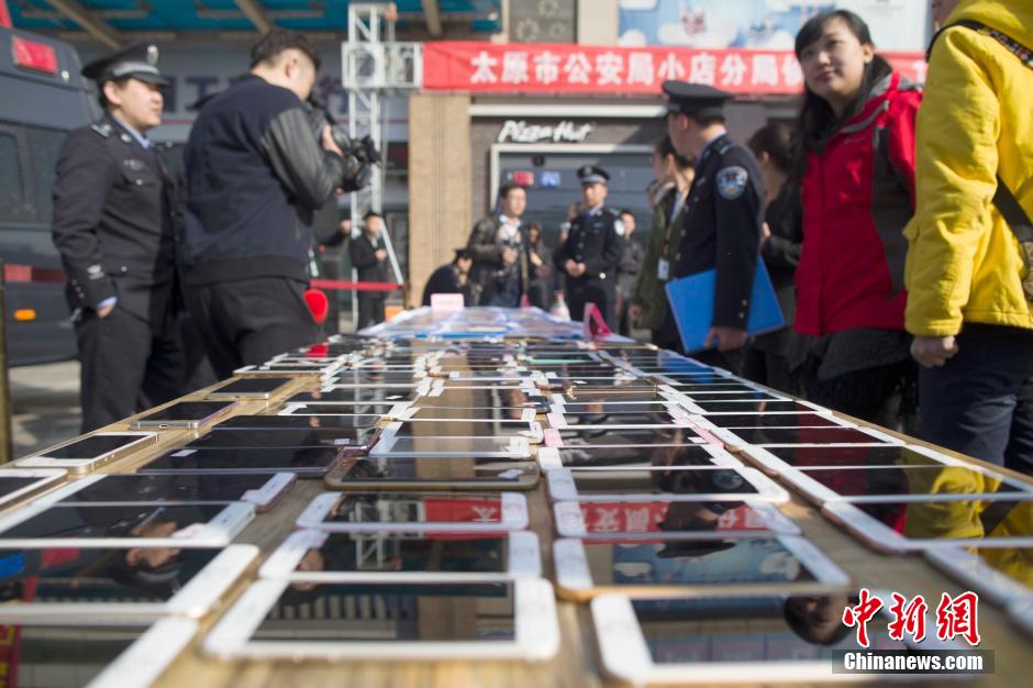 3月2日,山西太原警方發(fā)還民眾被盜手機(jī)。近日,太原市公安局偵破一個手機(jī)扒竊犯罪團(tuán)伙,破獲案件200余起,追繳手機(jī)180余部。張云 攝