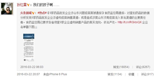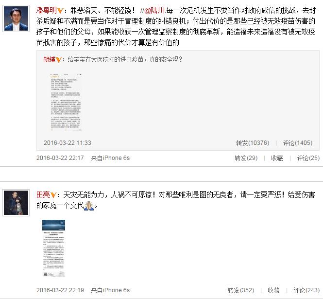 主持人胡蝶對疫苗產(chǎn)生莫大的質(zhì)疑,稱:“給寶寶在大醫(yī)院打的進(jìn)口疫苗,真的安全嗎?”隨后,陸川轉(zhuǎn)發(fā)此微博,并寫道:“每一次危機(jī)發(fā)生不要當(dāng)作對政府威信的挑戰(zhàn),去封殺質(zhì)疑和不滿而是要當(dāng)作對于管理制度的糾錯良機(jī);付出代價的是那些已經(jīng)被無效疫苗傷害的孩子和他們的父母,如果能收獲一次管理監(jiān)察制度的徹底革新,能造福未來造福沒有被無效疫苗戕害的孩子,那些慘痛的代價才算是有價值的。”潘粵明也寫在微博下“罪惡滔天、不能輕饒”的話語。