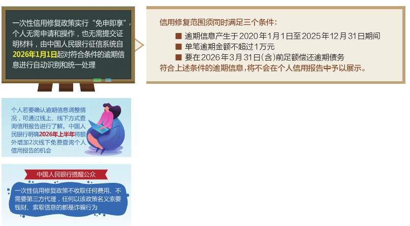在進行必要的技術準備后,中國人民銀行于22日明確發(fā)布一次性信用修復政策有關安排。自2026年1月1日起征信中心將根據(jù)不同還款情形完成自動調(diào)整,相關逾期記錄不再在個人信用報告中展示。