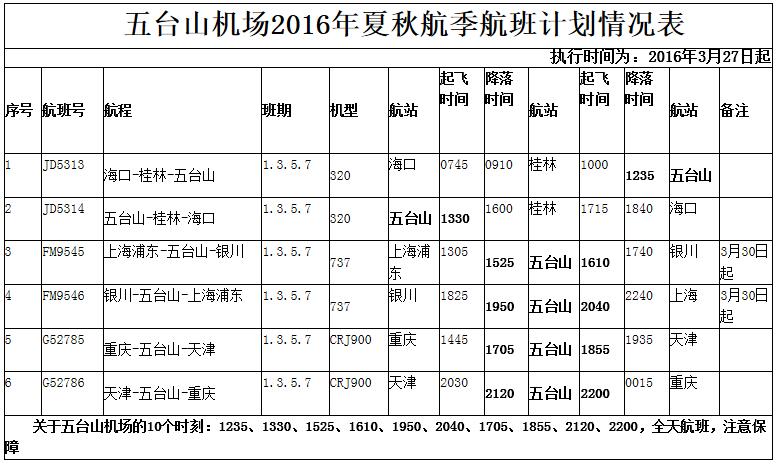 二、2016年3月27日忻州市五臺(tái)山機(jī)場(chǎng)執(zhí)行民航夏秋季航班時(shí)刻,每周一、三、五、日、每日五班的航班時(shí)刻,車(chē)輛運(yùn)營(yíng)線(xiàn)路和運(yùn)營(yíng)時(shí)間如下。