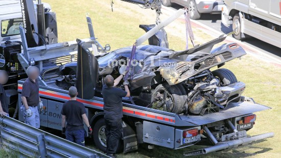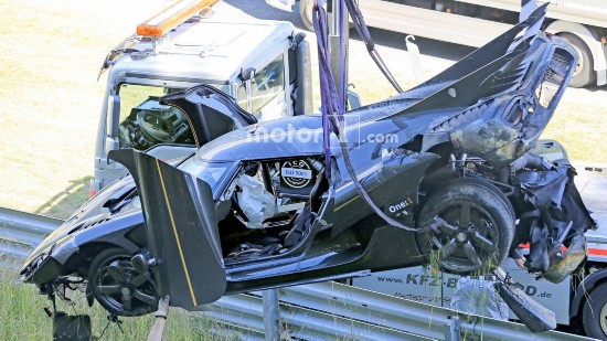 科尼塞克早上發(fā)布消息稱One:1打算在紐北刷新最快圈速紀(jì)錄。知情人表示,刷圈過程中,車輛在高速駛?cè)階denauer Forst彎時(shí)發(fā)生失控,車身撞跨賽道左側(cè)的護(hù)欄,進(jìn)而飛入草地,事故令One:1車身損毀嚴(yán)重,前保險(xiǎn)杠折斷、擋風(fēng)玻璃破碎,尾部受損。