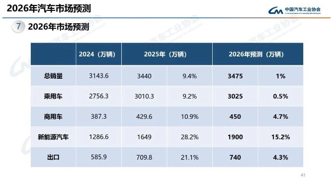 與此同時(shí),中汽協(xié)對(duì)2026年汽車(chē)市場(chǎng)進(jìn)行了預(yù)測(cè)。2026年,預(yù)計(jì)國(guó)產(chǎn)汽車(chē)總銷(xiāo)量將達(dá)到3475萬(wàn)輛,微增1%。其中,乘用車(chē)預(yù)計(jì)為3025萬(wàn)輛,微增0.5%;商用車(chē)預(yù)計(jì)為450萬(wàn)輛,小幅增長(zhǎng)4.7%;新能源汽車(chē)預(yù)計(jì)為1900萬(wàn)輛,增長(zhǎng)15.2%;汽車(chē)出口量預(yù)計(jì)為740萬(wàn)輛,小幅增長(zhǎng)4.3%。