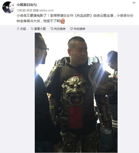 近日,網(wǎng)上流傳著一組岳云鵬身穿鎧甲手持寬重兵器的拍攝花絮照,照片中他一套夸張的武俠造型,霸氣外漏,一改以往“賤萌”的形象,引起網(wǎng)友們的圍觀。 據(jù)知情人士透露,照片中的岳云鵬正在為李湘的導(dǎo)演處女作《熱血戰(zhàn)歌》試裝。