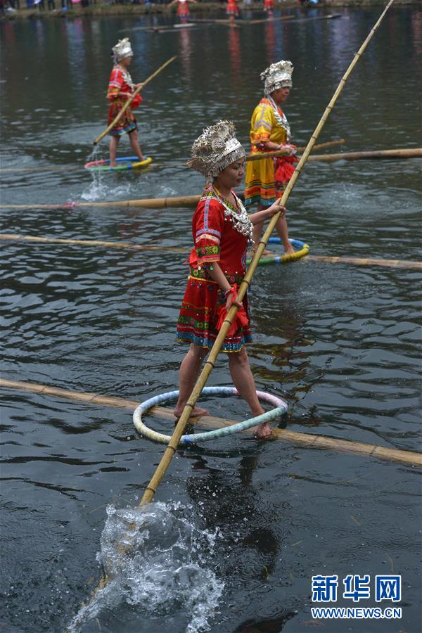 1月1日,“獨竹漂”愛好者在花溪河上表演水上高難度平衡動作。 2016年元旦,在貴陽市花溪公園平橋河段舉行的貴陽市第31屆冬泳表演活動中,數(shù)十名“獨竹漂”愛好者在花溪河上腳踏漂浮的竹竿,表演“金雞獨立”、轉身平衡等高難度動作,讓觀眾大飽眼福。新華社發(fā)(秦剛 攝)