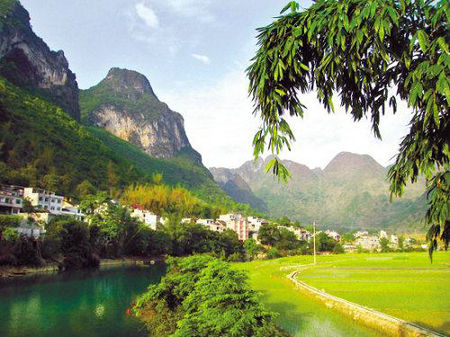 巴馬長(zhǎng)壽村盤陽河逶迤地流淌,串起了一個(gè)個(gè)小村落