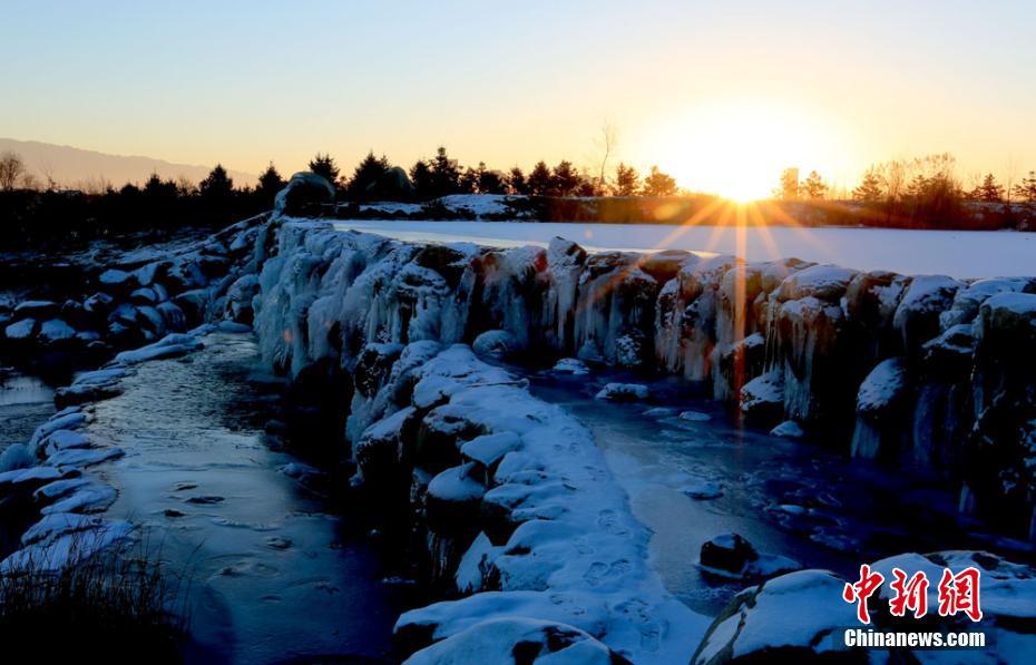 寒冬時(shí)節(jié),雪后初晴,地處甘肅河西走廊的張掖市濱河新區(qū)人工湖被白雪覆蓋,涓涓細(xì)流形成晶瑩剔透的冰瀑、冰掛,成為冬日一景。 陳禮 攝