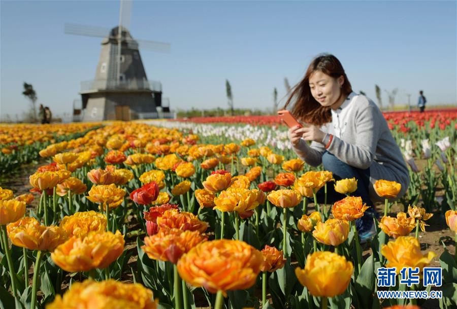 4月19日,游客在衡水湖森林公園欣賞郁金香。近日,河北衡水市冀州區(qū)衡水湖森林公園的48個品種、近百萬株郁金香競相開放,吸引游客前來觀賞游玩