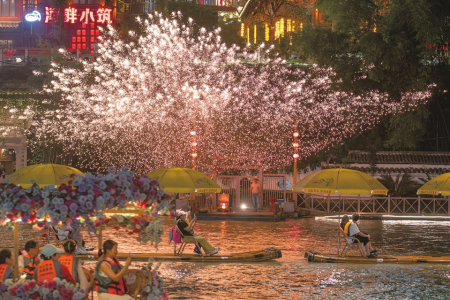 7月9日,游客乘坐“龍游貢水”竹筏在貢水河上觀賞打鐵花表演。位于湖北省恩施土家族苗族自治州的宣恩縣城是一座“景城一體·主客共享”的國家4A級(jí)景區(qū)。近年來,當(dāng)?shù)夭粩嗤脐惓鲂碌摹褒堄呜曀敝穹ぁ跖翊润w驗(yàn)和觀賞項(xiàng)目,讓游客在璀璨燈火中沉浸式感受山區(qū)小城的夜色魅力。