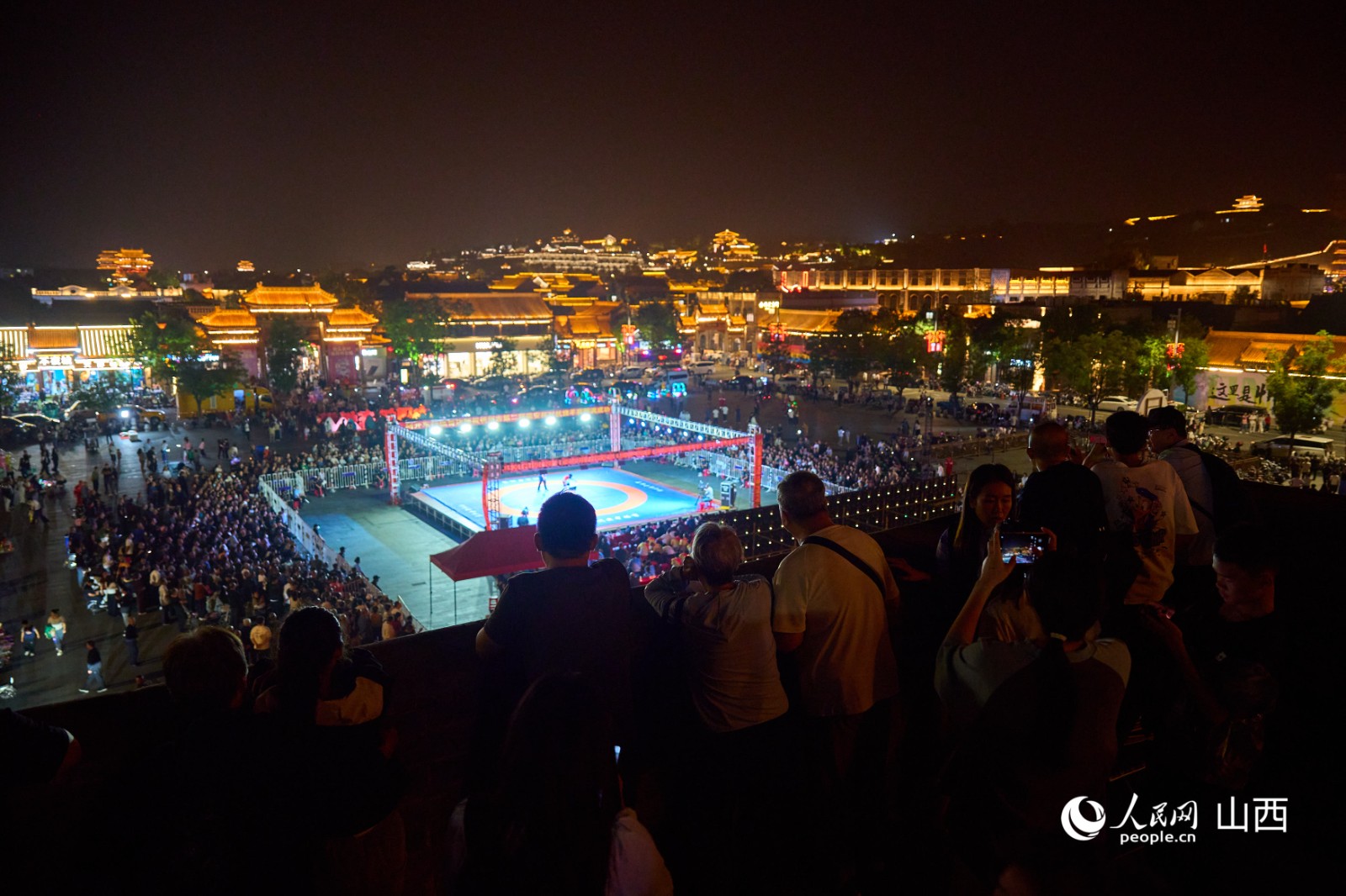 游客們?cè)谛弥莨懦浅菈ι嫌^看對(duì)抗撓羊賽。人民網(wǎng) 張超寧攝