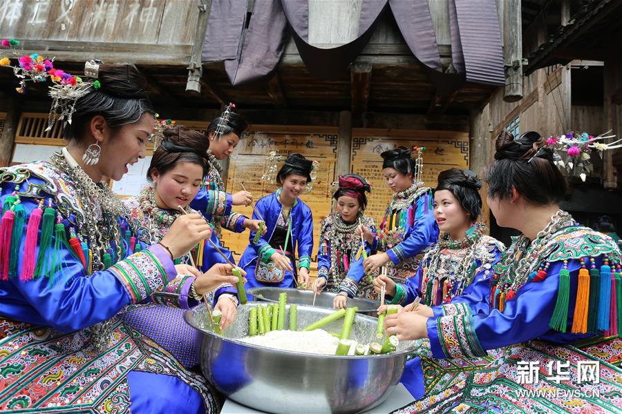 5月3日,貴州省首批魅力侗寨——榕江縣烏公侗寨歡度傳統(tǒng)的竹米節(jié),重溫侗民遠(yuǎn)古農(nóng)耕風(fēng)情。竹米節(jié)也叫吃竹筍飯,在每年谷雨至立夏期間竹筍生長(zhǎng)的時(shí)候,侗族群眾采摘斑竹筍,把糯米灌進(jìn)筍筒煮熟食用。這樣既能保持米飯的原味,又有竹筍的清香,并且還方便攜帶至坡上田間地頭食用。久而久之,侗族人每到春夏之交的農(nóng)耕時(shí)節(jié)都會(huì)過竹米節(jié),殺豬宰羊祭祀侗族祖先,唱歌跳舞祈求五谷豐登。新華社發(fā)(楊成利 攝)
