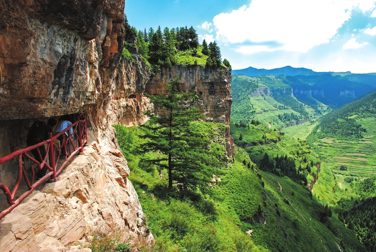 懸崖棧道位于寧武縣清真山,屬額狀丹霞巖地貌,由唐代貞元年間始建的佛教懸空古剎群與棧道共同構(gòu)成。棧道原長(zhǎng)42華里,現(xiàn)有修復(fù)段5華里及羅漢殿、毗盧殿等建筑群,其中羅漢殿“回聲階”屬全國(guó)五大回聲建筑之一。懸崖棧道的攀爬較為艱險(xiǎn),需要兩個(gè)小時(shí),途中要攀登懸崖、臺(tái)階,還要穿越僅可容一人通過(guò)的山間隧道。