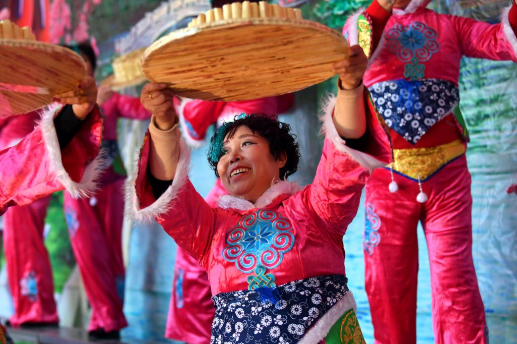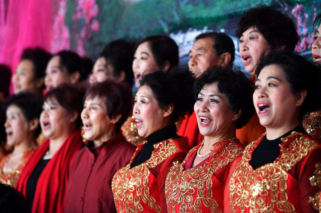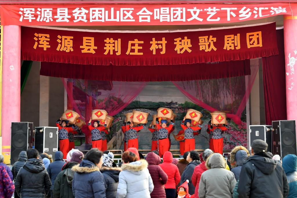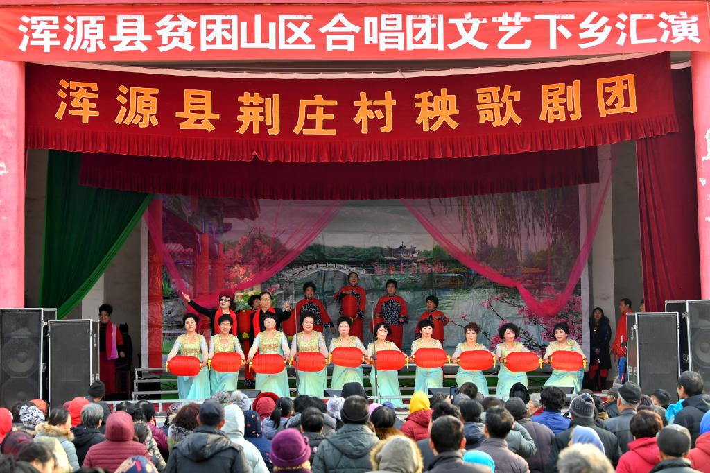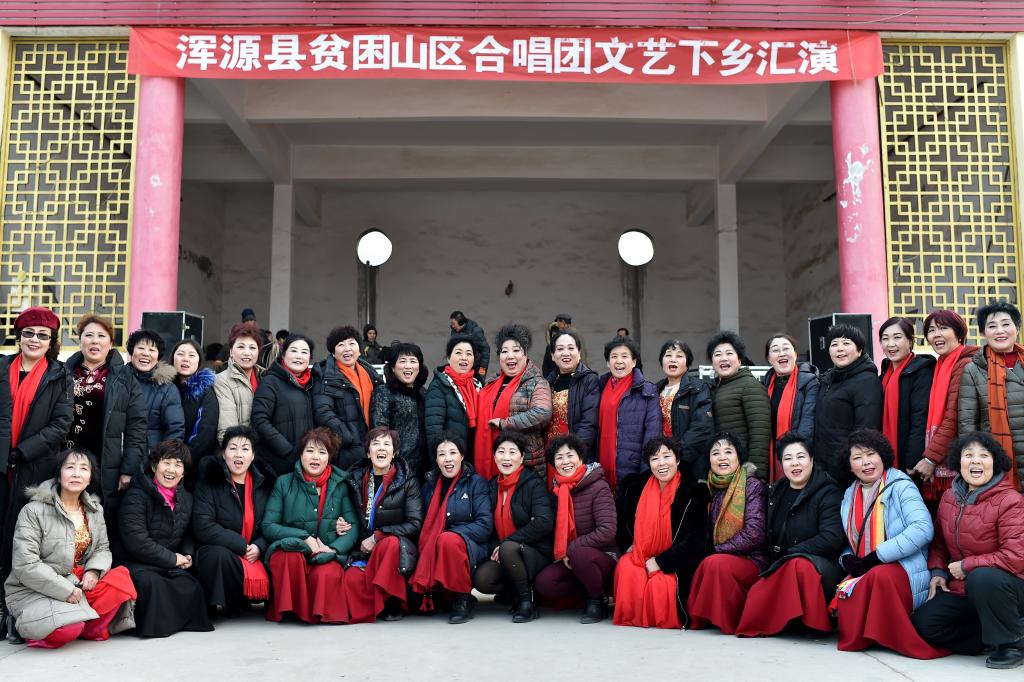 ↑1月3日,在山西省渾源縣荊莊村,渾源縣貧困山區(qū)合唱團在表演歌舞《看山看水看中國》。