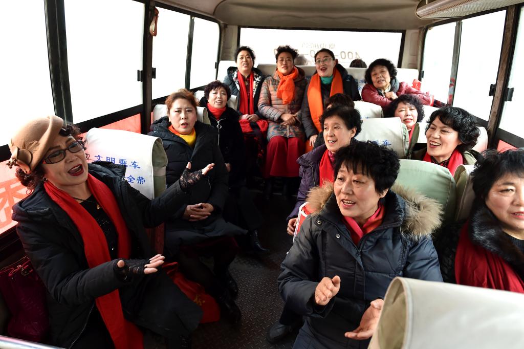 ↑1月3日,渾源縣貧困山區(qū)合唱團團員們在前往荊莊村的大巴車上排練。