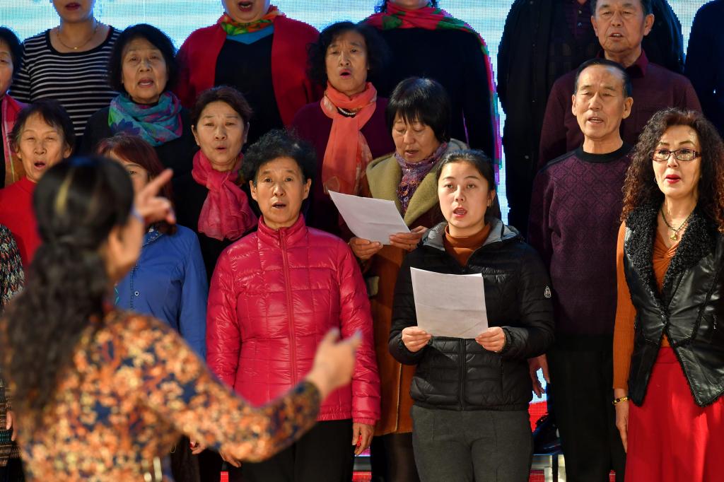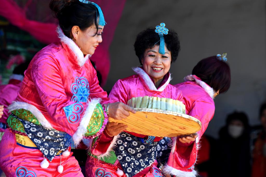 ↑1月2日,在山西省渾源縣山陰山村,村民在練習渾源縣貧困山區(qū)合唱團新教的秧歌。