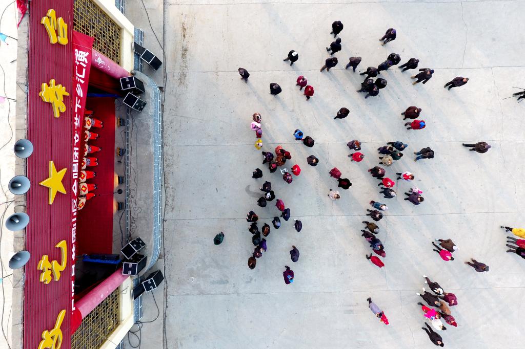 ↑1月3日,在山西省渾源縣荊莊村,村民們在欣賞渾源縣貧困山區(qū)合唱團的演出(無人機拍攝)。