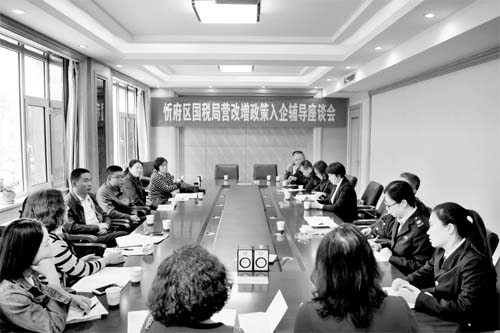 本報(bào)訊 4月19日下午,忻府區(qū)國(guó)稅局營(yíng)改增政策入企輔導(dǎo)座談會(huì)在忻州國(guó)力房地產(chǎn)開發(fā)有限公司會(huì)議室召開。區(qū)局黨組書記、局長(zhǎng)郭靜出席,政策法規(guī)科科長(zhǎng)王繼紅主持會(huì)議,稅源管理科負(fù)責(zé)人和房地產(chǎn)企業(yè)代表一同參加。