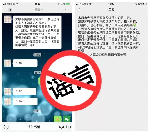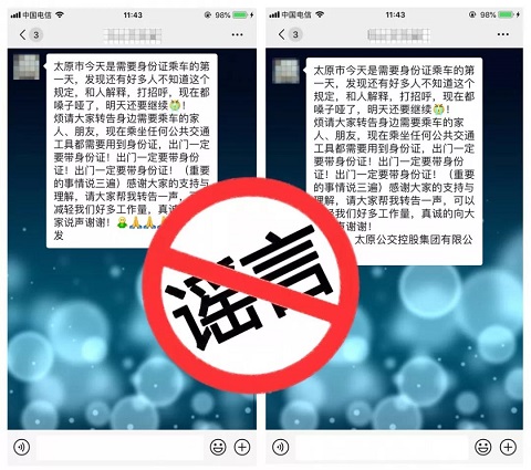 近日,微信朋友圈、釘釘、微博等社交平臺均在傳播“乘坐公交車需要出示身份證”的傳言。您收到了嗎?