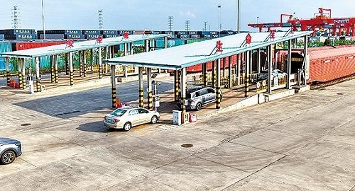 廣州國際物流港基地,工作人員駕駛待運(yùn)車輛進(jìn)入車廂。張國卿攝