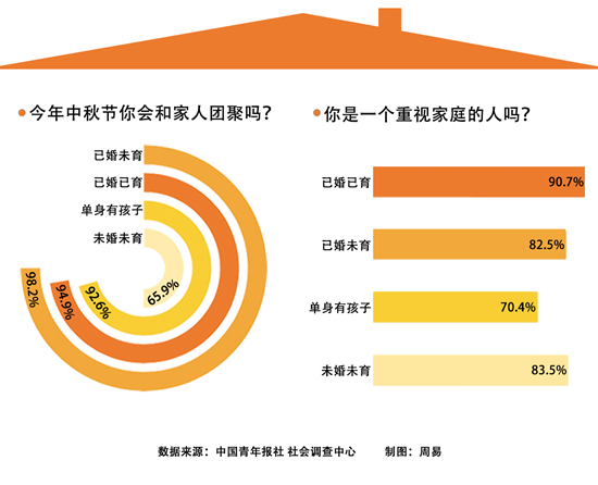 調(diào)查顯示,今年中秋節(jié),92.9%的受訪者會和家人團聚。已婚未育的受訪者這一比例最高(98.2%),未婚未育受訪者這一比例最低(65.9%)。