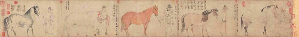 《五馬圖》以白描的手法畫了五匹名馬,依次為鳳頭驄、錦膊驄、好頭赤、照夜白、滿川花。每匹馬均有一個人牽引,其中兩人著西域服裝、三人穿漢人衣服,人馬均以單線勾勒,流暢而內斂,反映出高超的白描技藝。