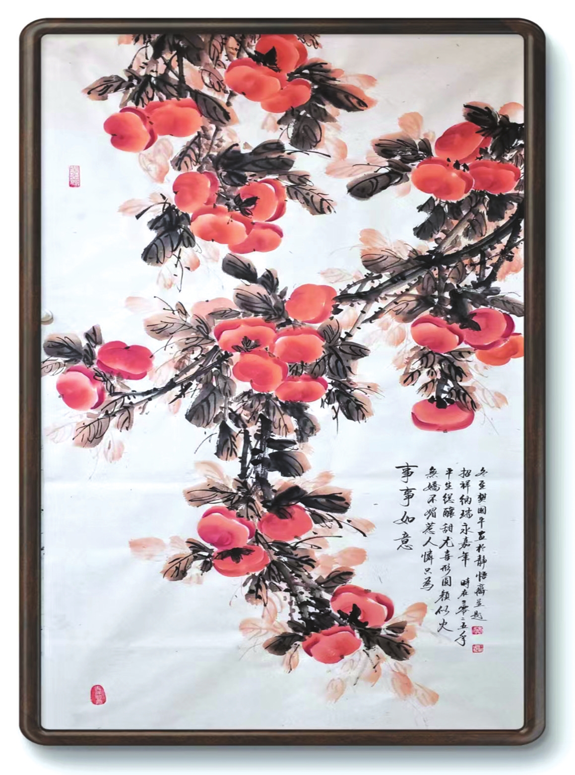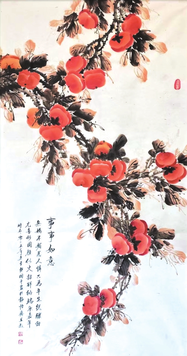 在樊國平眾多題材探索中,《事事如意》系列柿子圖可謂其藝術(shù)精神與人生哲思的縮影。這些作品超越了尋?;B畫的怡情悅性,成為她寄托情懷、叩問生命的重要載體。畫中那一串串、一簇簇丹柿,色澤溫潤,形態(tài)豐盈,承載著諧音“事事如意”的吉祥寓意,滿足了社會對美滿生活的樸素祈愿。她以此通俗意象為入口,引領(lǐng)觀者步入一個融匯儒、道、佛哲學(xué)理念的深邃境界,實(shí)踐著中國藝術(shù)“技進(jìn)乎道”“以畫載道”的至高追求。