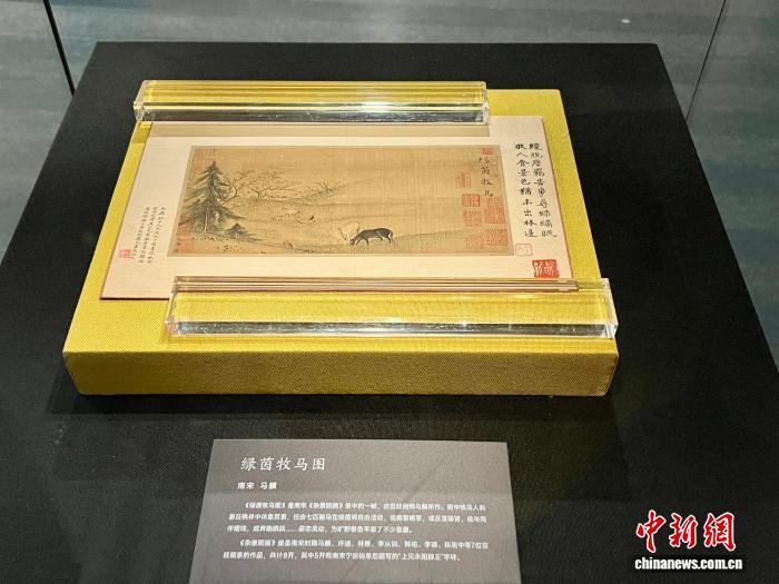 杜芝明稱(chēng),為系統(tǒng)闡釋馬文化的深厚內(nèi)涵,該館對(duì)相關(guān)館藏文物進(jìn)行了全面細(xì)致梳理。其中,被譽(yù)為“鎮(zhèn)館之寶”的南宋《雜景院畫(huà)》冊(cè)頁(yè)里,一幀珍貴的《綠茵牧馬圖》得以特別展出。