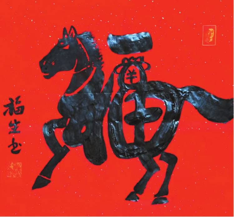 生肖文化,是中華民俗之根脈,王福生緊扣福字主題,應時而作,應物而書,將十二生肖意象與福字完美融合,創(chuàng)作出獨具氣象的“生肖?!毕盗?,合于《道德經(jīng)》“動善時”的智慧——順天時,合地利,應人心,與時俱化。其馬年“馬上?!笨胺Q福字神品:以草書筆勢,將“?!迸c“馬”渾然合一,“礻”為駿馬昂首,鬃毛飛揚;“畐”為身軀矯健,奮蹄向前;“田”化為鞍飾,點睛傳神。整幅福作一氣呵成,筆走龍蛇,靈動奔放,卻又穩(wěn)而不飄,勁而不躁,正是老子“知其雄,守其雌”的筆墨體現(xiàn)。