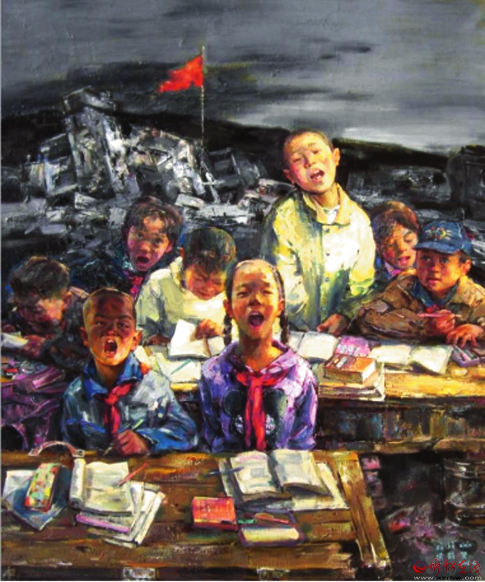 同樣表現(xiàn)地震題材的另一幅作品《震后復(fù)課》則展示出另外一種浪漫情懷,發(fā)人深省,令人感慨萬千。在尚未處理完畢的地震廢墟上,孩子們真誠地開始了希望的追求,展示著大震壓不垮的人性力量和災(zāi)后最具震撼力的希望。是的,紅旗在哪里,精神支撐就在哪里。孩子是希望,是未來。在孩子們的臉上,沒有恐懼和悲哀,沒有茫然與無助,有的只是對(duì)知識(shí)的渴望,對(duì)未來的憧憬。一個(gè)角落的復(fù)課場(chǎng)景,映射著中華民族偉大復(fù)興的精神力量。 邢晨聲 文