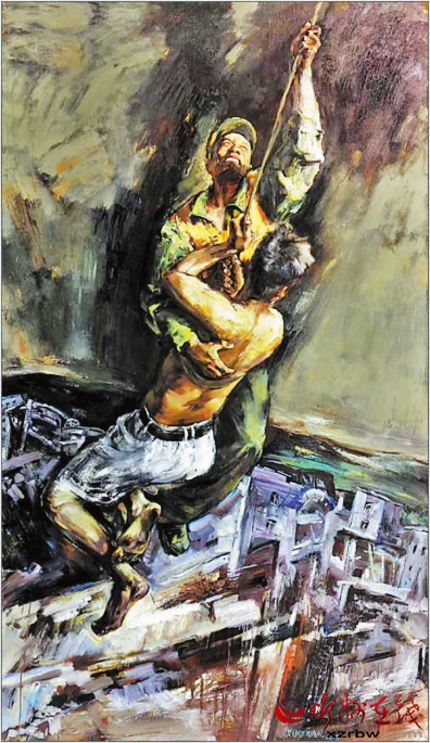 作品《空中救援》中,觀者首先感受到的就是難度。主題表現(xiàn)的事件難度和畫面表現(xiàn)處理的難度交織在一起,讓我們?cè)隗@險(xiǎn)、焦急的心理壓力下感受到生命的脆弱??罩芯仍闪松奈ㄒ煌ǖ馈>仍瑯邮请U(xiǎn)象環(huán)生、驚心動(dòng)魄。從畫面處理技巧上是一種挑戰(zhàn),天空與地面的透視關(guān)系,動(dòng)感與靜態(tài)的對(duì)立統(tǒng)一,那種命懸一線的緊迫感對(duì)心理的沖擊力,通過大刀闊斧的刮刀、筆觸處理,和蒼涼緊迫的色調(diào)關(guān)系,準(zhǔn)確地展示了主題思想,大膽省略了一些不必要的細(xì)節(jié)描寫。用大筆觸、大色塊表現(xiàn)背景的壓抑和險(xiǎn)峻,救援主體成為沖破這一重壓的希望之色。沒有去刻意刻畫天與地的真實(shí)場(chǎng)景,簡(jiǎn)潔概括但不呆板空洞,這種果斷的駕馭,是續(xù)鶴賢真實(shí)實(shí)力的體現(xiàn)。 邢晨聲 文