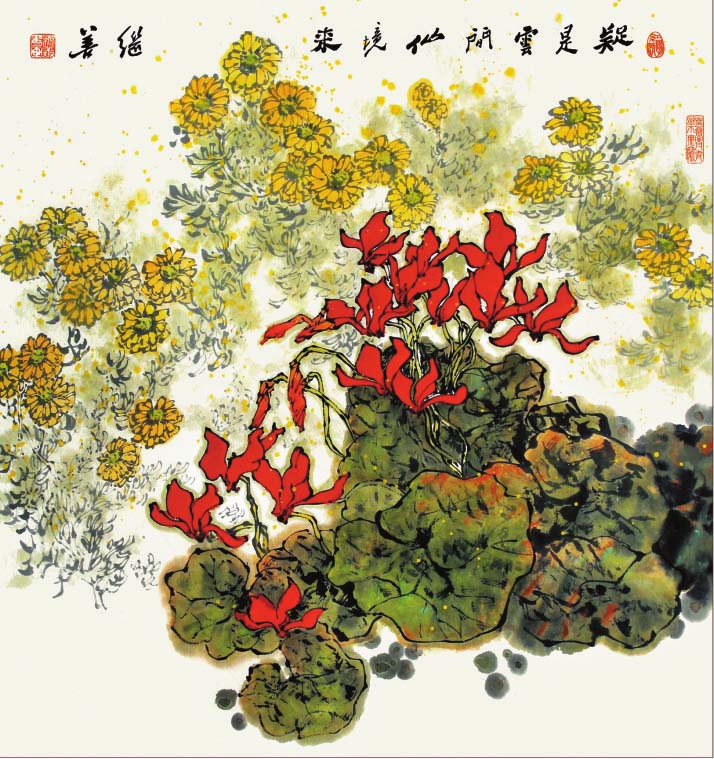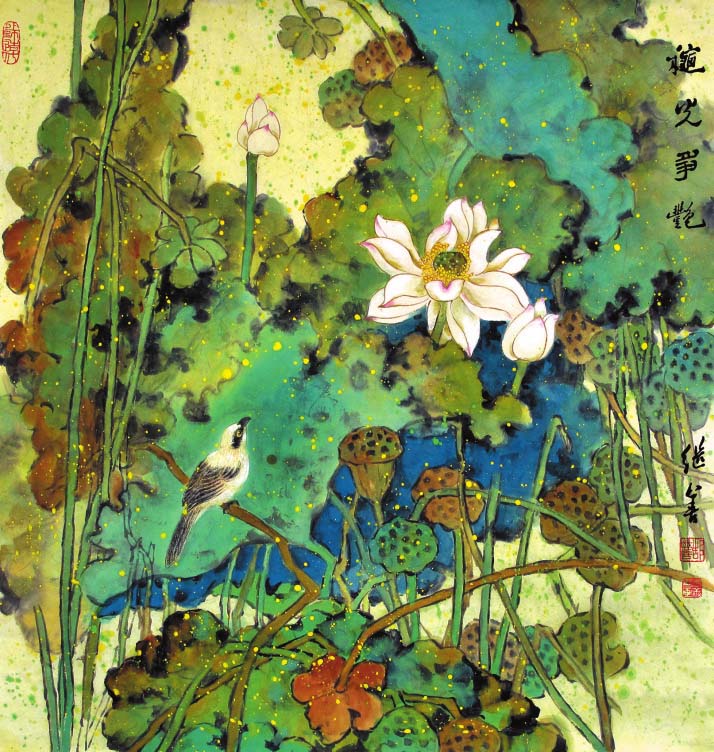 郜繼善的重彩花鳥畫偏傳統(tǒng),筆法細(xì)膩工整,色彩明麗典雅,構(gòu)圖大氣別致,情趣盎然,意境深遠(yuǎn)。作品中各種元素有機(jī)融合,自然穿插,形成和諧有序的布局,讓人既能感受到自然界的豐富與絢爛,又可體味藝術(shù)帶來的愉悅和感動。在他的筆下,重彩成為了最具藝術(shù)感染力的手段,也是最有個性藝術(shù)特征的語言,鮮明、強(qiáng)烈,可謂“脫盡媚俗寫重彩”。