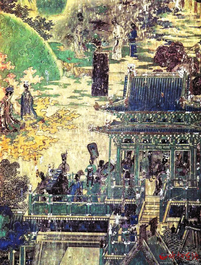 畫面中,有頭戴冠冕、身著長(zhǎng)袍的王子,焚香祈禱的王后;有嬉戲玩耍的兒童,酒樓市井里的說唱賣藝者;還有撐傘的、捧鳥籠的凡夫俗子,儼然一幅幅生動(dòng)的古代宮廷生活圖、古代市井圖。豪華宮殿、樓閣、古塔、作坊、民居各類建筑應(yīng)有盡有,無不體現(xiàn)出畫師高超的技藝。