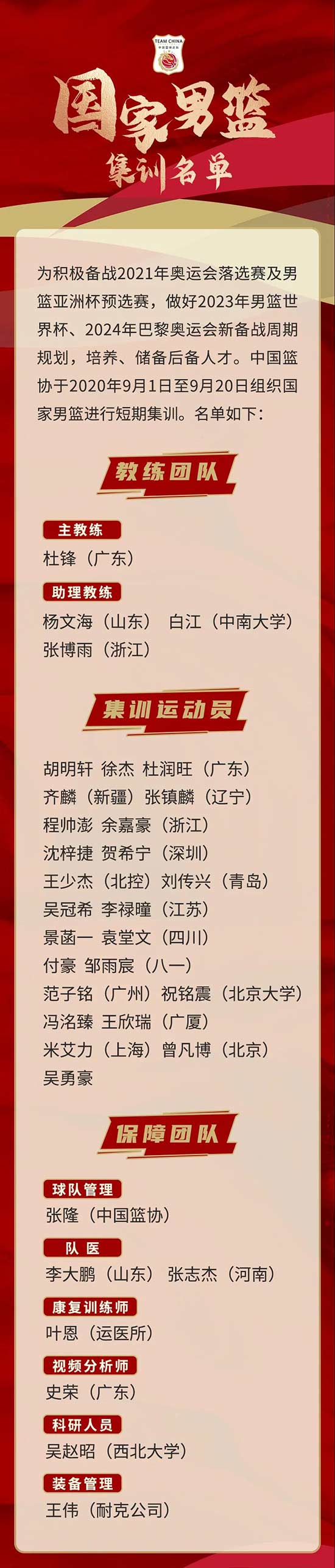 此次入選中國(guó)男籃集訓(xùn)大名單的球員有:廣東隊(duì)胡明軒、徐杰、杜潤(rùn)旺,新疆隊(duì)齊麟,浙江隊(duì)程帥澎、余嘉豪,深圳隊(duì)沈梓捷、賀希寧,北控隊(duì)王少杰,遼寧隊(duì)張鎮(zhèn)麟,青島隊(duì)劉傳興,廣州隊(duì)范子銘,北京大學(xué)祝銘震,江蘇隊(duì)吳冠希、李祿瞳,四川隊(duì)景菡一、袁堂文,八一隊(duì)付豪、鄒雨宸,廣廈隊(duì)馮洺臻、王欣瑞,上海隊(duì)米艾力,北京隊(duì)曾凡博和吳勇豪,共24人。教練組成員為主教練杜鋒,以及助理教練楊文海、白江、張博雨。