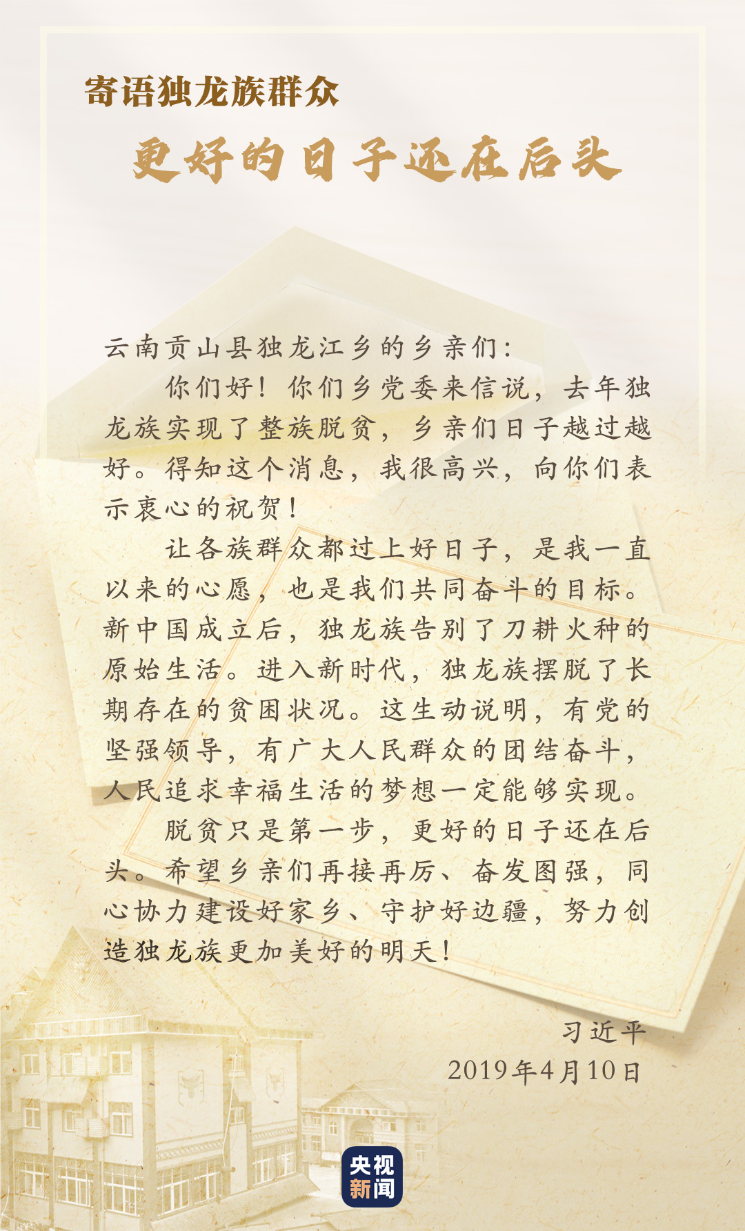 總書記的深切關(guān)懷激勵(lì)著獨(dú)龍族干部群眾在全面脫貧、全面建成小康社會(huì)的道路上奮力前行。