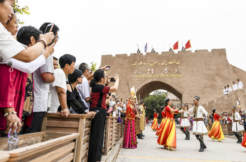 在新疆喀什古城景區(qū)“開城”儀式上,游客在觀看歌舞表演(2019年8月13日攝)。新華社記者 王菲 攝
