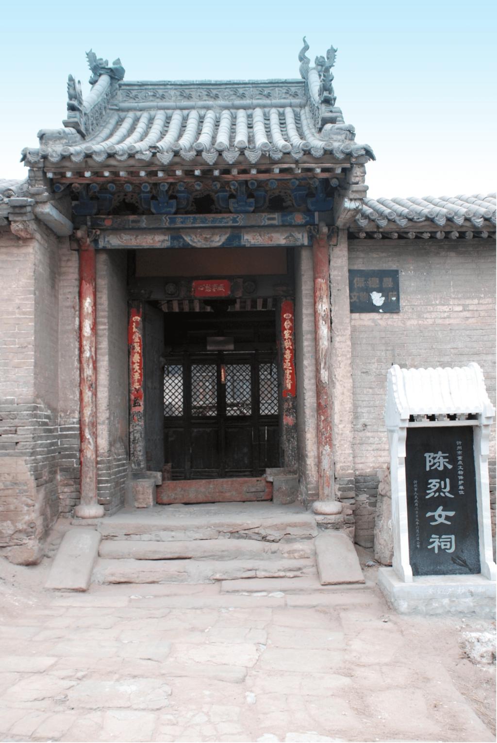 陳烈女祠坐西向東,為二進(jìn)院落布局。占地面積685平方米。大門一座,前院過殿面寬三間,單檐硬山頂;南北配殿各面寬三間,單檐硬山頂。后院正殿面寬三間,單檐硬山頂,前設(shè)小抱廈;后院正殿內(nèi)供奉陳烈女塑像。祠內(nèi)存有明崇禎七年(1634)“圣旨(復(fù)制品)”一道,新繪壁畫16平方米。2007年6月,陳烈女祠被忻州市人民政府公布為市級文物保護單位。