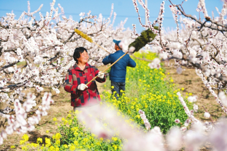 3月19日,永濟(jì)市韓陽(yáng)鎮(zhèn)長(zhǎng)旺村杏園里,杏農(nóng)正在對(duì)杏花進(jìn)行授粉作業(yè)。李向東攝