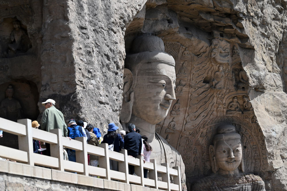 4月15日,游客在山西大同云岡石窟游覽。成立于2021年的云岡研究院