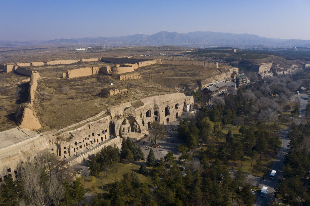 這是2024年11月7日拍攝的云岡石窟全景(無(wú)人機(jī)照片)。