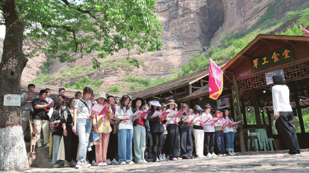在壯麗的崖壁背景下,嘹亮的歌聲響起,《三大紀律八項注意》《勤儉是咱們的傳家寶》……一首首經典旋律,將嚴明的紀律要求與樸素的廉潔觀念,通過激昂的音符直抵人心。歌聲在山谷間激蕩,廉潔的種子在集體共鳴中悄然播撒。