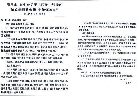 圖12 山西抗日民族統(tǒng)一戰(zhàn)線的鞏固發(fā)展 圖1 1937年9月20日,周恩來(lái)、劉少奇關(guān)于山西統(tǒng)一戰(zhàn)線的策略問(wèn)題致朱德、彭德懷等電。 圖2 山西新軍既是戰(zhàn)斗隊(duì),又是工作隊(duì)。他們走到哪里,宣傳到哪里,動(dòng)員青年參軍;組織人民武裝自衛(wèi)隊(duì)、游擊隊(duì);協(xié)助地方建黨、建政,組建工、農(nóng)、青、婦等群眾團(tuán)體,創(chuàng)建抗日根據(jù)地。圖為1938年初,決死隊(duì)?wèi)?zhàn)士在沁縣書(shū)寫(xiě)宣傳標(biāo)語(yǔ)。 圖3 1938年7月,岢嵐縣各界歡送戰(zhàn)動(dòng)總會(huì)晉察綏邊區(qū)工作團(tuán)隨八路軍大青山支隊(duì)北上大青山,創(chuàng)建抗日根據(jù)地時(shí)留影。 圖4 中條山人民抗日武裝自衛(wèi)隊(duì)、晉中人民抗日武裝自衛(wèi)隊(duì)、興縣婦女先鋒隊(duì)、沁源縣兒童團(tuán)。 圖5 從1937年9月成立到1938年,戰(zhàn)動(dòng)總會(huì)先后在第二戰(zhàn)區(qū)內(nèi)組建了17個(gè)游擊支隊(duì),另有山西工人武裝自衛(wèi)旅(簡(jiǎn)稱工衛(wèi)旅)、察綏游擊軍、1個(gè)政治保衛(wèi)隊(duì)、2個(gè)地方游擊隊(duì),還有戰(zhàn)區(qū)各縣游擊隊(duì)、自衛(wèi)隊(duì)等。圖為1942年10月工衛(wèi)旅在興縣舉行成立5周年紀(jì)念大會(huì)后,司令部與政治部全體干部合影。 圖6 女民兵在集訓(xùn)。 山西抗日民主根據(jù)地的建立發(fā)展 1937年11月太原失守后,山西抗戰(zhàn)進(jìn)入了一個(gè)新的階段。在華北,以國(guó)民黨為主體的正規(guī)戰(zhàn)爭(zhēng)基本結(jié)束,以共產(chǎn)黨為主體的游擊戰(zhàn)爭(zhēng)上升到主要地位。八路軍分別以五臺(tái)山、管涔山、太行山、呂梁山為依托,相繼從晉東北、晉西北、晉東南向晉察冀、晉綏、晉冀豫邊區(qū)和晉西南地區(qū)擴(kuò)展,建立了晉察冀、晉綏、晉冀豫抗日根據(jù)地,為建立以山西為中心的華北游擊戰(zhàn)爭(zhēng)戰(zhàn)略支點(diǎn)、實(shí)行更大規(guī)模的戰(zhàn)略展開(kāi)奠定了基礎(chǔ),山西成為八路軍堅(jiān)持華北抗戰(zhàn)的“立足點(diǎn)”和擴(kuò)大與發(fā)展華北抗戰(zhàn)的“出發(fā)地”。此后,以山西為中心的敵后抗日根據(jù)地不斷發(fā)展,由山地到平原,由山西向冀東、冀南、冀魯豫邊、冀熱察、綏遠(yuǎn)大青山挺進(jìn)。1938年11月,在“鞏固華北,發(fā)展華中”戰(zhàn)略方針下,八路軍三大主力師各一部挺進(jìn)冀中、冀南、山東,開(kāi)辟了廣闊的華北敵后戰(zhàn)場(chǎng)。 晉察冀抗日根據(jù)地是黨領(lǐng)導(dǎo)創(chuàng)建的第一個(gè)敵后抗日根據(jù)地,被黨中央譽(yù)為“敵后模范的抗日根據(jù)地及統(tǒng)一戰(zhàn)線的模范區(qū)”。晉綏抗日根據(jù)地與陜甘寧邊區(qū)隔河相望,形成了阻敵西進(jìn)的堅(jiān)固屏障,是保衛(wèi)駐守延安的中共中央的前沿陣地。晉冀魯豫抗日根據(jù)地,包括太行、太岳、冀南、冀魯豫抗日根據(jù)地,是與山東抗日根據(jù)地相互策應(yīng)的戰(zhàn)略區(qū),幅員廣闊,中共中央北方局和八路軍總部長(zhǎng)期駐扎在太行,領(lǐng)導(dǎo)指揮華北軍民抗日斗爭(zhēng)。(連載3) 圖7 八路軍總司令朱德(左)、副總司令彭德懷(右)在山西武鄉(xiāng)縣八路軍總部駐地。 圖8 1937年11月,八路軍第一一五師一部開(kāi)辟以五臺(tái)山為中心的晉察冀抗日根據(jù)地。圖為毛澤東題寫(xiě)書(shū)名的《抗日模范根據(jù)地晉冀察邊區(qū)》一書(shū)。 圖9 1937年12月,八路軍第一二九師開(kāi)辟以太行山為中心的晉冀豫抗日根據(jù)地。圖為朱德(右)與劉伯承(中)、鄧小平(左)在研究根據(jù)地建設(shè)。 圖10 1938年1月,八路軍第一一五師主力開(kāi)辟晉西南抗日根據(jù)地。圖為羅榮桓(二排左三)、楊尚昆(二排左二)等在孝義。 圖11 1938年3月,八路軍第一一五師在隰縣發(fā)起午城戰(zhàn)斗,粉碎了日軍渡河西犯的企圖。圖為戰(zhàn)斗中繳獲的汽車(chē)。 圖12 1938年春,晉西北抗日根據(jù)地軍民打退日軍的五路圍攻,收復(fù)寧武、神池等7座縣城。圖為部隊(duì)在收復(fù)寧武縣城戰(zhàn)斗中。 文圖由中共山西省委黨史研究院(山西省地方志研究院)提供 (責(zé)任編輯:盧相?。?/span> |